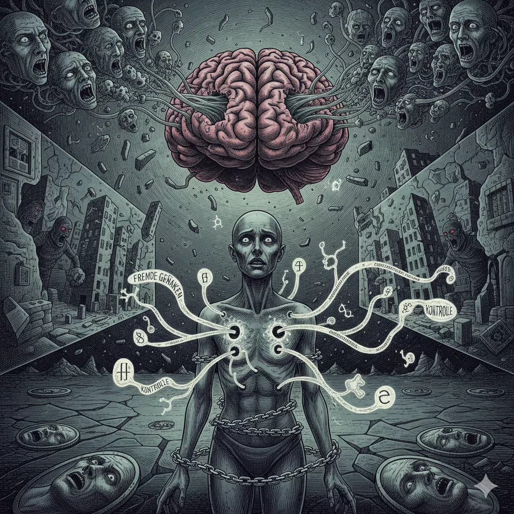 Die Ich-Störung ist vielleicht das unheimlichste Symptom. Normalerweise wissen wir instinktiv: „Das ist mein Gedanke“ oder „Das ist meine Hand“. Bei einer Ich-Störung löst sich diese Gewissheit auf.