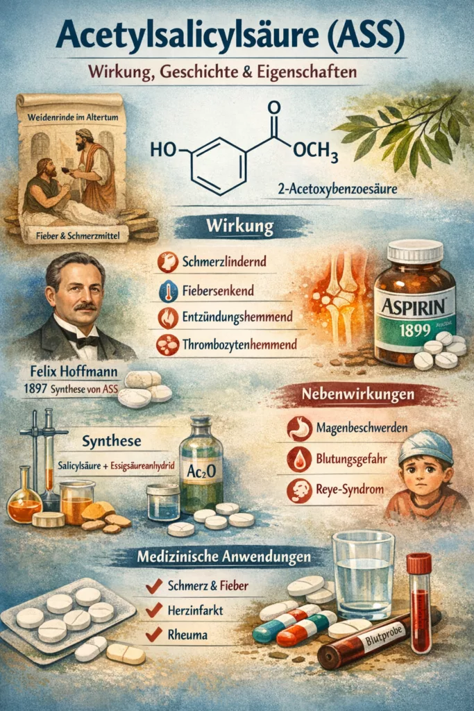 Acetylsalicylsäure – kurz ASS – gehört zu den bekanntesten und am weitesten verbreiteten Arzneistoffen der Welt. Sie wirkt schmerzstillend, fiebersenkend, entzündungshemmend und hemmt die Blutplättchenaggregation. In deinem Dokument heißt es dazu: „Acetylsalicylsäure (Trivialname, auch Azetylsalizylsäure; kurz ASS) ist ein weit verbreiteter schmerzstillender, entzündungshemmender, fiebersenkender und thrombozytenaggregationshemmender Arzneistoff.“ Diese Vielseitigkeit macht ASS zu einem der bedeutendsten Medikamente der modernen Medizin.